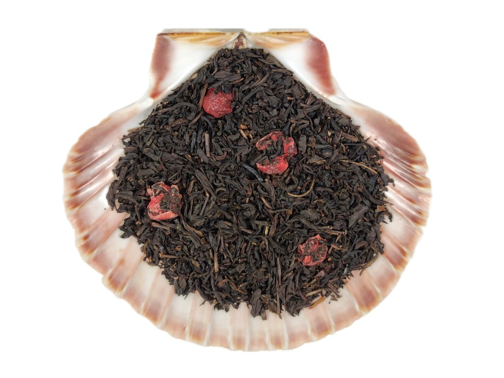 Černý čaj, kousky třešní (cukr, slunečnicový olej), aroma.