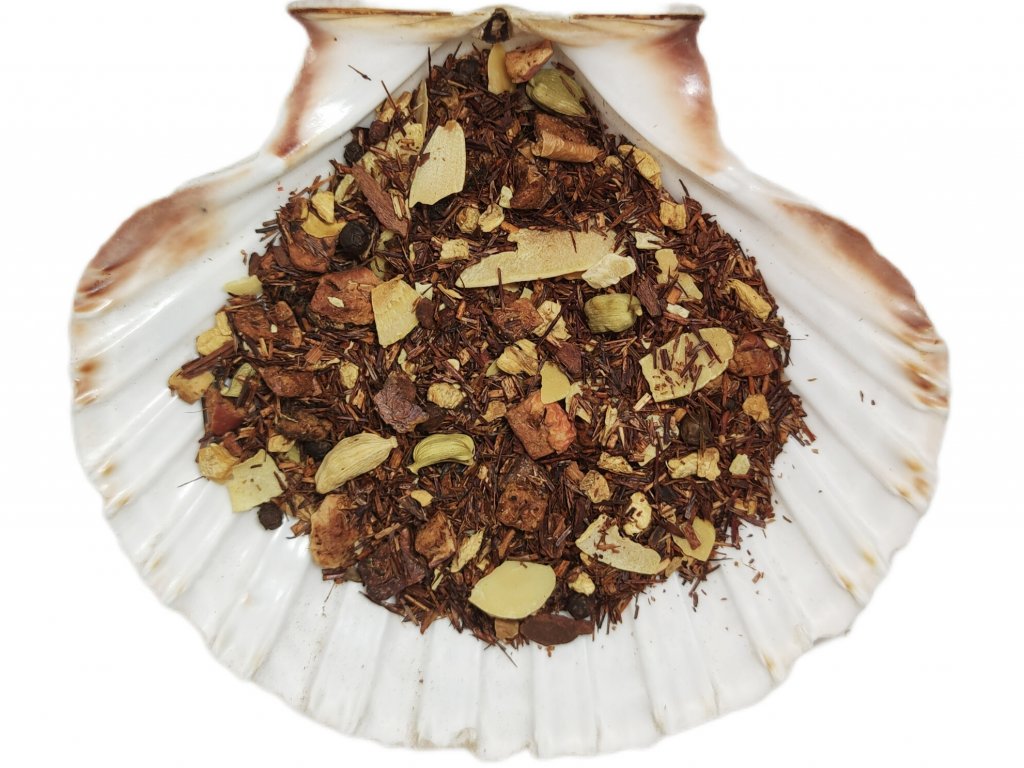 Červený rooibos, zázvor, kousky jablka, skořice, kokos, mandle kousky, kardamom, černý pepř, aroma.